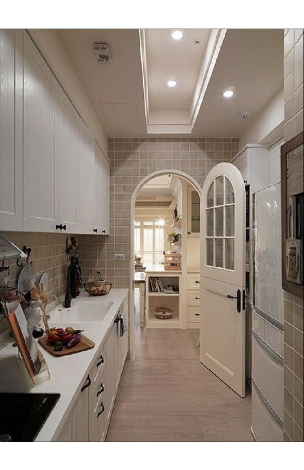 廚房仿木紋地磚的鋪設使廚房地面與外面的地面結合為一體。墻磚的選擇也是田園氣息濃重。